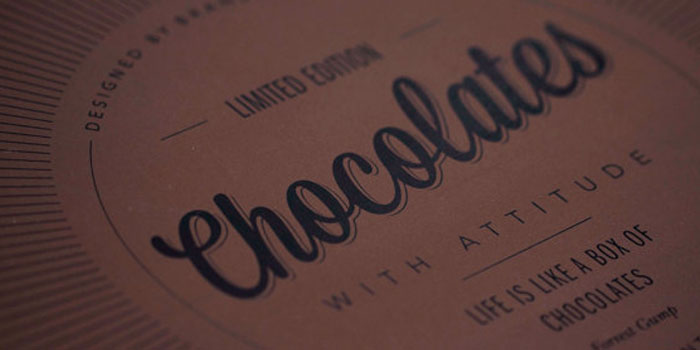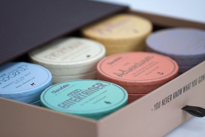 “個性是通過一個獨特的報價,一個獨特的設計和獨特的類型的巧克力表達。設計區分了12種不同的字體,字體的使用,這些小字體是圓形的,像是小帽子。巧克力是可口精品巧克力獨特的配方了。一切都是從地上發展的。”